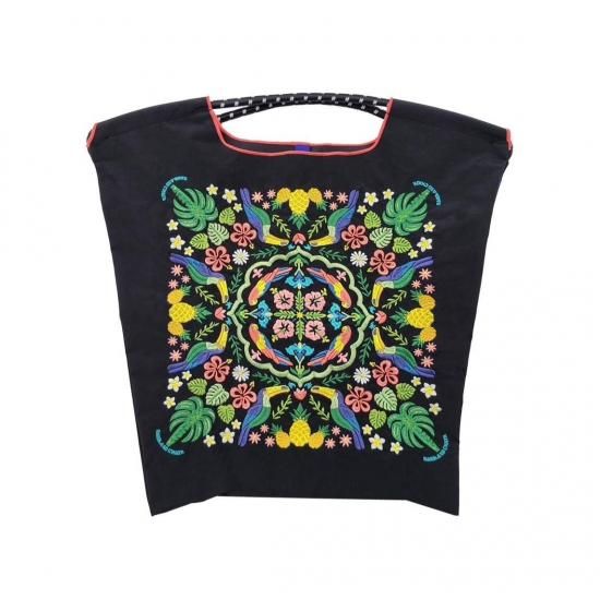 厚手のナイロン生地に刺しゅうでデザインを施したショッピングバッグは、耐久性に優れ、折りたたむとコンパクトになり、持ち運びにも便利です。