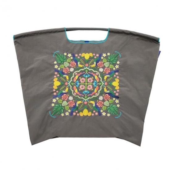 厚手のナイロン生地に刺しゅうでデザインを施したショッピングバッグは、耐久性に優れ、折りたたむとコンパクトになり、持ち運びにも便利です。