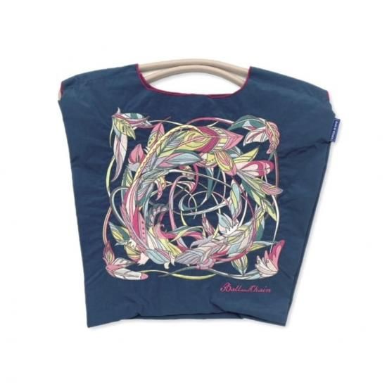 厚手のナイロン生地に刺しゅうでデザインを施したショッピングバッグは、耐久性に優れ、折りたたむとコンパクトになり、持ち運びにも便利です。