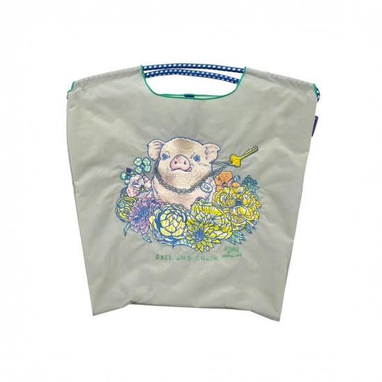 厚手のナイロン生地に刺しゅうでデザインを施したショッピングバッグは、耐久性に優れ、折りたたむとコンパクトになり、持ち運びにも便利です。