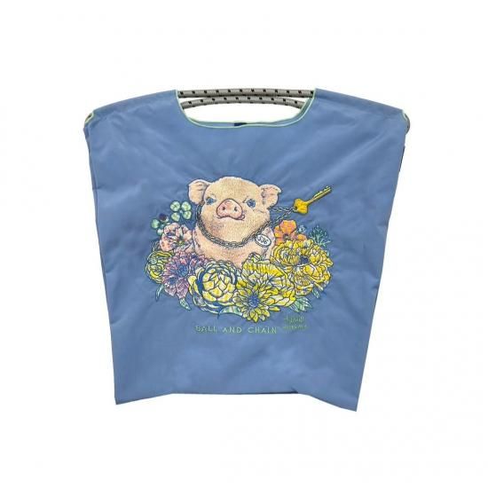 厚手のナイロン生地に刺しゅうでデザインを施したショッピングバッグは、耐久性に優れ、折りたたむとコンパクトになり、持ち運びにも便利です。