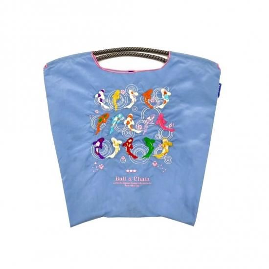 厚手のナイロン生地に刺しゅうでデザインを施したショッピングバッグは、耐久性に優れ、折りたたむとコンパクトになり、持ち運びにも便利です。
