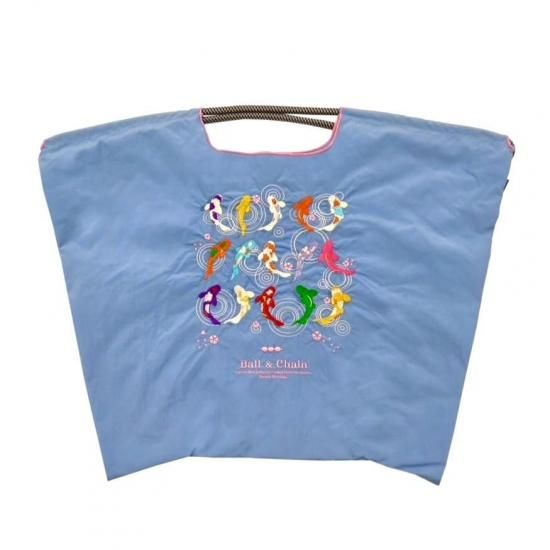 厚手のナイロン生地に刺しゅうでデザインを施したショッピングバッグは、耐久性に優れ、折りたたむとコンパクトになり、持ち運びにも便利です。